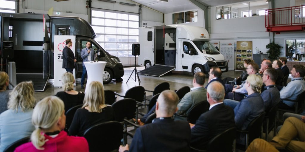 Nach kurzer Begrüßung, dem Warming-Up, im beeindruckenden Showroom des Böckmann Horse Truck Centers folgte der Marketing-Talk: ein Interview mit Initiator Timo Kaapke und dem diesmaligen Gastgeber Klaus Böckmann. Im Gespräch gewährte Böckmann nicht nur exklusive Einblicke in das eigene Marketing des erfolgreichen Familienunternehmens. Er berichtete ebenfalls über die Marke Böckmann, die für erstklassige Qualität made in Germany steht, traditionelles Handwerk bewahrt und zugleich weltweit für Innovationen sorgt.