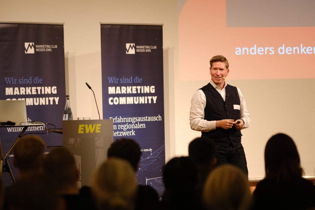 Am Montagabend war es in den besonderen Räumlichkeiten der Alten Fleiwa in Oldenburg wieder soweit – ein Highlight Club-Abend wartete auf die ca. 100 Gäste des Marketing Club Weser Ems. Und es sollte ein ganz besonderer werden. In einer packenden Keynote lud Gunnar Barghorn, CEO der Barghorn GmbH & Co. KG, die Anwesenden auf eine Reise in seine außergewöhnliche Führungsphilosophie ein. In seinem Metallbauunternehmen, welches er in inzwischen dritter Generation leitet, führte er unkonventionelle, spannende und auch experimentierfreudige Prozesse ein, die sicherlich alles andere als „normal“ sind. Er nennt sich selbst „Humanunternehmer“ und sieht seine Mitarbeiter vor allem als Kunden. Als Kunden am Produkt Arbeitsplatz. „Wenn ihr wollt, dass Mitarbeiter Leistung erbringen, müsst ihr den Nährboden dafür schaffen“, beginnt Barghorn. „Wir wollen den vollen Fokus auf das, was Menschen bewegt.“ Er berichtet über den Abbau von Reibungen innerhalb der Teams, innerhalb der Arbeitsabläufe, über Transparenz, ehrliche Kommunikation, Vertrauen, Freiheit und Eigenständigkeit.