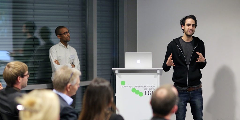 Sie sind jung. Sie haben Ideen. Und sie sind erfolgreich: Torben Buttjer und Sohrab Mohammad. Es handelt sich um zwei junge diplomierte Wirtschafts-Ingenieure, die mit ihrem Bremer Start-up-Unternehmen REISHUNGER (abgeleitet von Heißhunger) auf Anhieb ins Schwarze getroffen haben. In einem äußerst erfrischenden Vortrag präsentierte Sohrab das Unternehmen am 9. Februar 2015 im Technologiezentrum Oldenburg (TGO). Die Zuhörer im vollbesetzten Saal staunten nicht schlecht über die rasante Geschichte, die hinter diesem Unternehmen steckt.