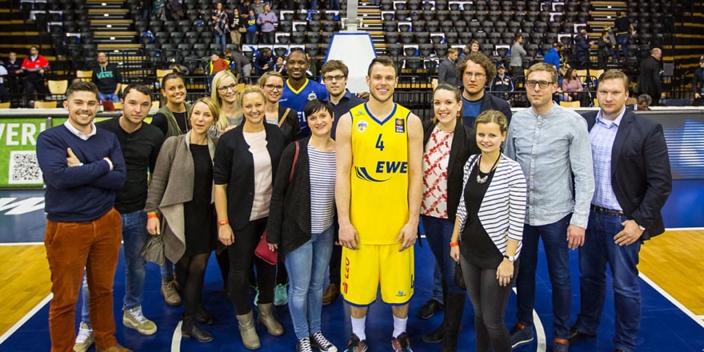 Nach den Vorträgen hatten die JuMPs in der VIP-Lounge selbst die Möglichkeit zu Netzwerken und sich auszutauschen, bevor es um 20 Uhr zum Anpfiff der Baskets gegen Hagen ging. In der fast ausverkauften Arena konnten die JuMPs dann einmal selbst miterleben, wie Basketball-Bundesliga in der Stadt Oldenburg aussieht. Nach einem spannenden Spiel mit Sieg für die EWE Baskets folgte dann das abschließende Highlight, ein gemeinsame Gruppenfoto auf dem Spielfeld zusammen mit den Spielern Ricky Paulding und Chris Kramer. Ausklingen lassen haben die JuMPs den Abend dann noch in gemütlicher, angeregter Atmosphäre in der VIP Lounge.